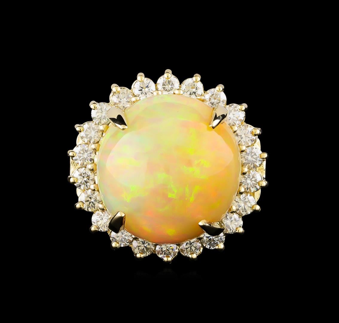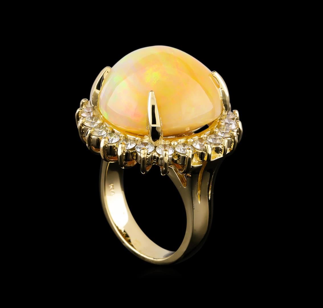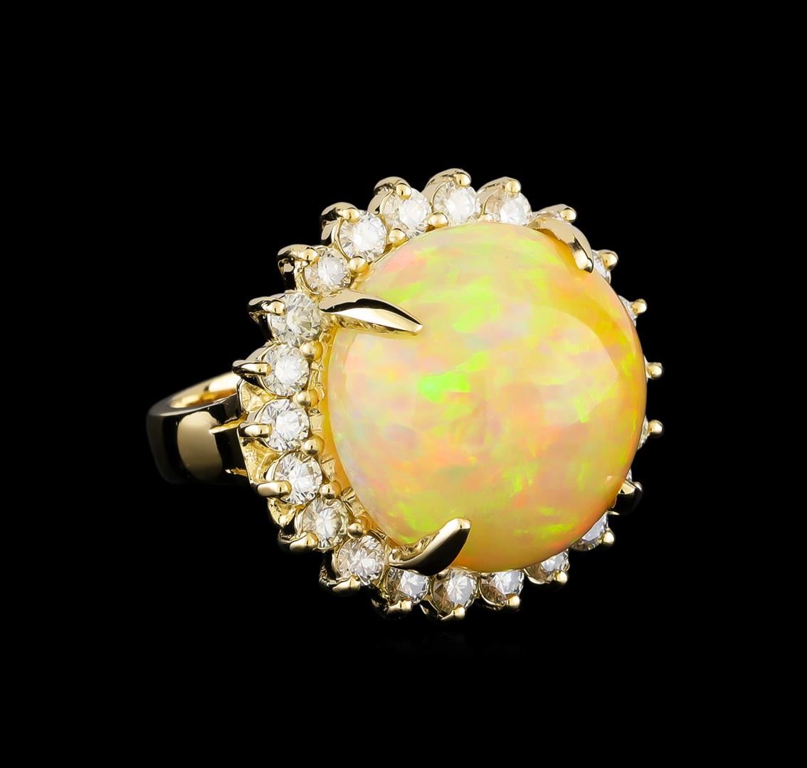 One electronically tested 14KT yellow gold lady's cast fashion ring with a basket halo with a bright polish finish. The featured lady's ring has a shank measuring 4.20 millimeters in width. Identified with markings of "K14". Condition is new, good workmanship. Containing: Twenty-Two prong set round brilliant cut diamonds, measuring 2.90 - 2.80 x 1.71mm (depth est.) approximate total weight of 22 Stones = 1.88ct. Graded in the setting. Clarity: VS-2 to SI-1. Color: H - I. Cut Very Good One orange crystal that is cut in a round shaped cabochon and is prong set, measuring 18.83 mm long x 18.20 mm wide, and 13.00 mm thick and the approximate weight is 19.85 carats. The opal has a bright, orange-red play of color (fire) in a rolling flashfire pattern; a high dome; a good cut; no inclusions; consistent in its brightness and pattern; and is not directional. Graded in the setting. Total Weight of Diamonds 1.88ct. Total Weight of Opals 19.85ct. Total Weight of Ring 17.30gm GAS Appraised at $12,740.00.
