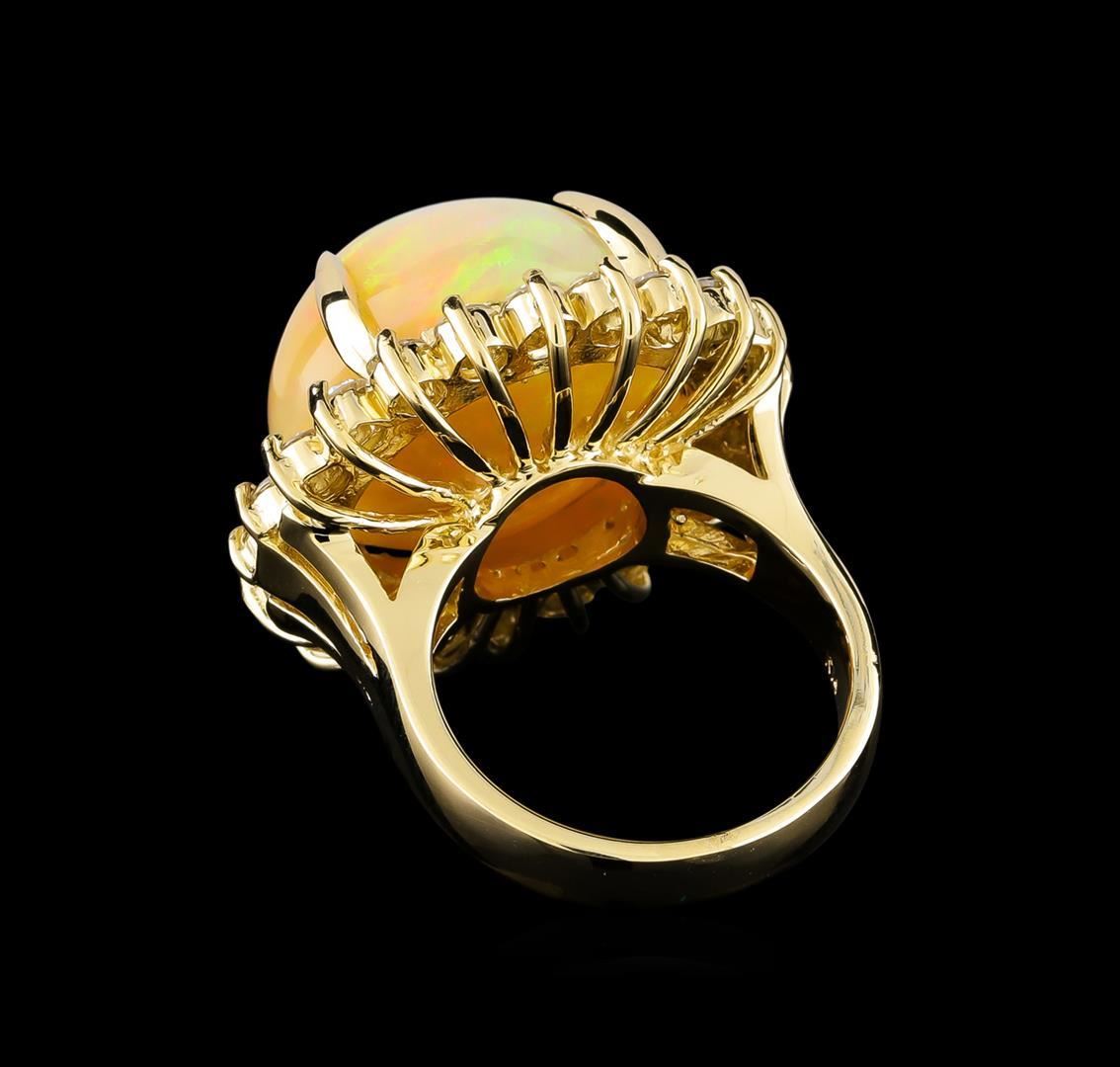 One electronically tested 14KT yellow gold lady's cast fashion ring with a basket halo with a bright polish finish. The featured lady's ring has a shank measuring 4.20 millimeters in width. Identified with markings of "K14". Condition is new, good workmanship. Containing: Twenty-Two prong set round brilliant cut diamonds, measuring 2.90 - 2.80 x 1.71mm (depth est.) approximate total weight of 22 Stones = 1.88ct. Graded in the setting. Clarity: VS-2 to SI-1. Color: H - I. Cut Very Good One orange crystal that is cut in a round shaped cabochon and is prong set, measuring 18.83 mm long x 18.20 mm wide, and 13.00 mm thick and the approximate weight is 19.85 carats. The opal has a bright, orange-red play of color (fire) in a rolling flashfire pattern; a high dome; a good cut; no inclusions; consistent in its brightness and pattern; and is not directional. Graded in the setting. Total Weight of Diamonds 1.88ct. Total Weight of Opals 19.85ct. Total Weight of Ring 17.30gm GAS Appraised.