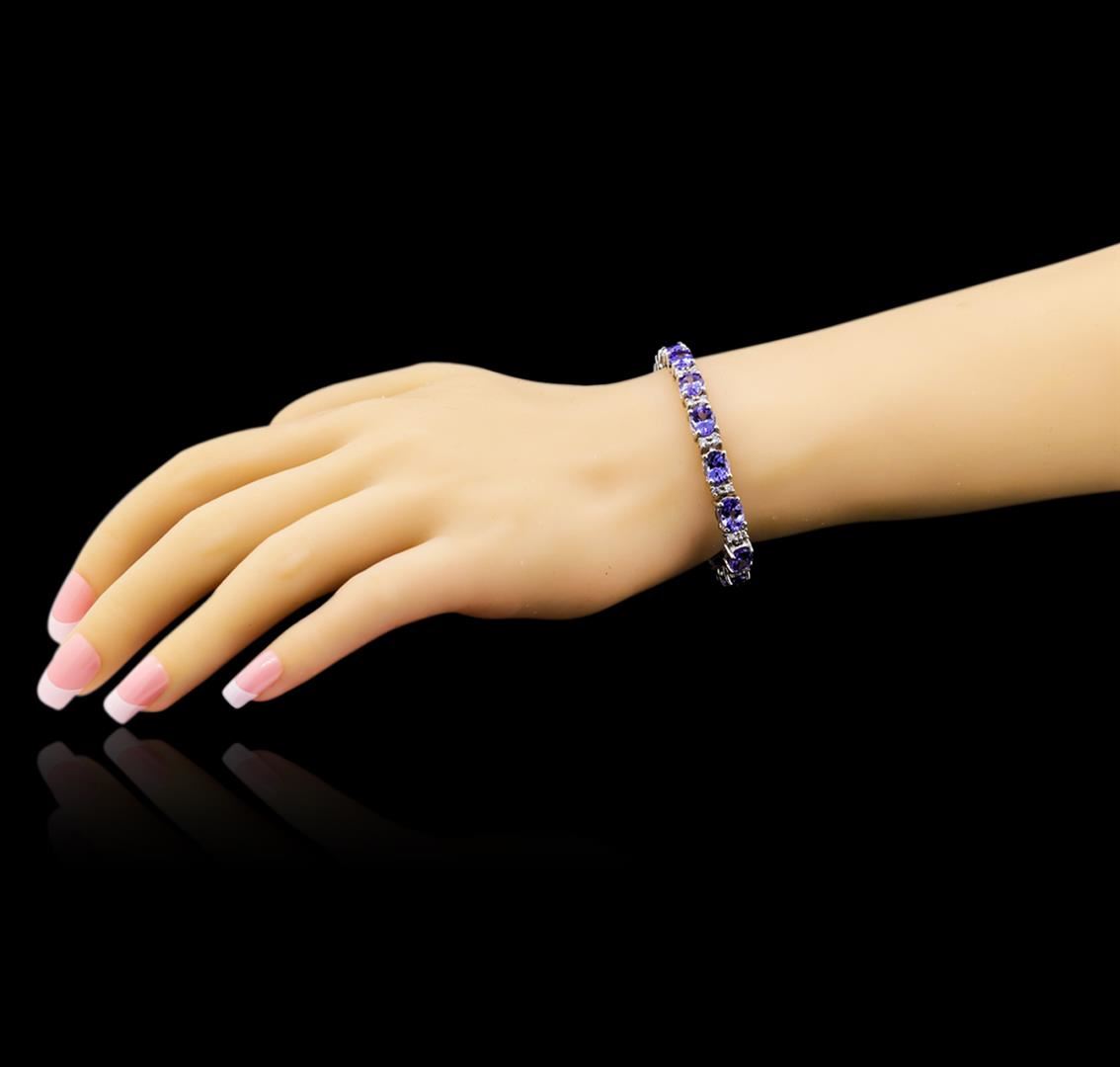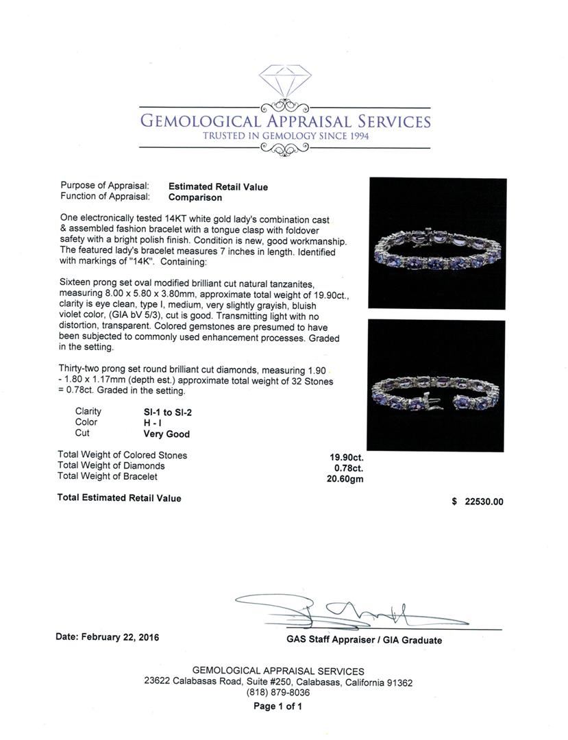 One electronically tested 14KT white gold lady's combination cast & assembled fashion bracelet with a tongue clasp with foldover safety with a bright polish finish. The featured lady's bracelet measures 7 inches in length. Identified with markings of "14K". Condition is new, good workmanship. Containing: Sixteen prong set oval modified brilliant cut natural tanzanites, measuring 8.00 x 5.80 x 3.80mm, approximate total weight of 19.90ct., clarity is eye clean, type I, medium, very slightly grayish, bluish violet color, (GIA bV 5/3), cut is good. Transmitting light with no distortion, transparent. Colored gemstones are presumed to have been subjected to commonly used enhancement processes. Graded in the setting. Thirty-Two prong set round brilliant cut diamonds, measuring 1.90 - 1.80 x 1.17mm (depth est.) approximate total weight of 32 Stones = 0.78ct. Graded in the setting. Clarity: SI-1 to SI-2. Color: H - I. Cut Very Good. Total Weight of Colored Stones 19.90ct. Total Weight of Diamonds 0.78ct. Total Weight of Bracelet 20.60gm. GAS Appraised at $22,530.00.