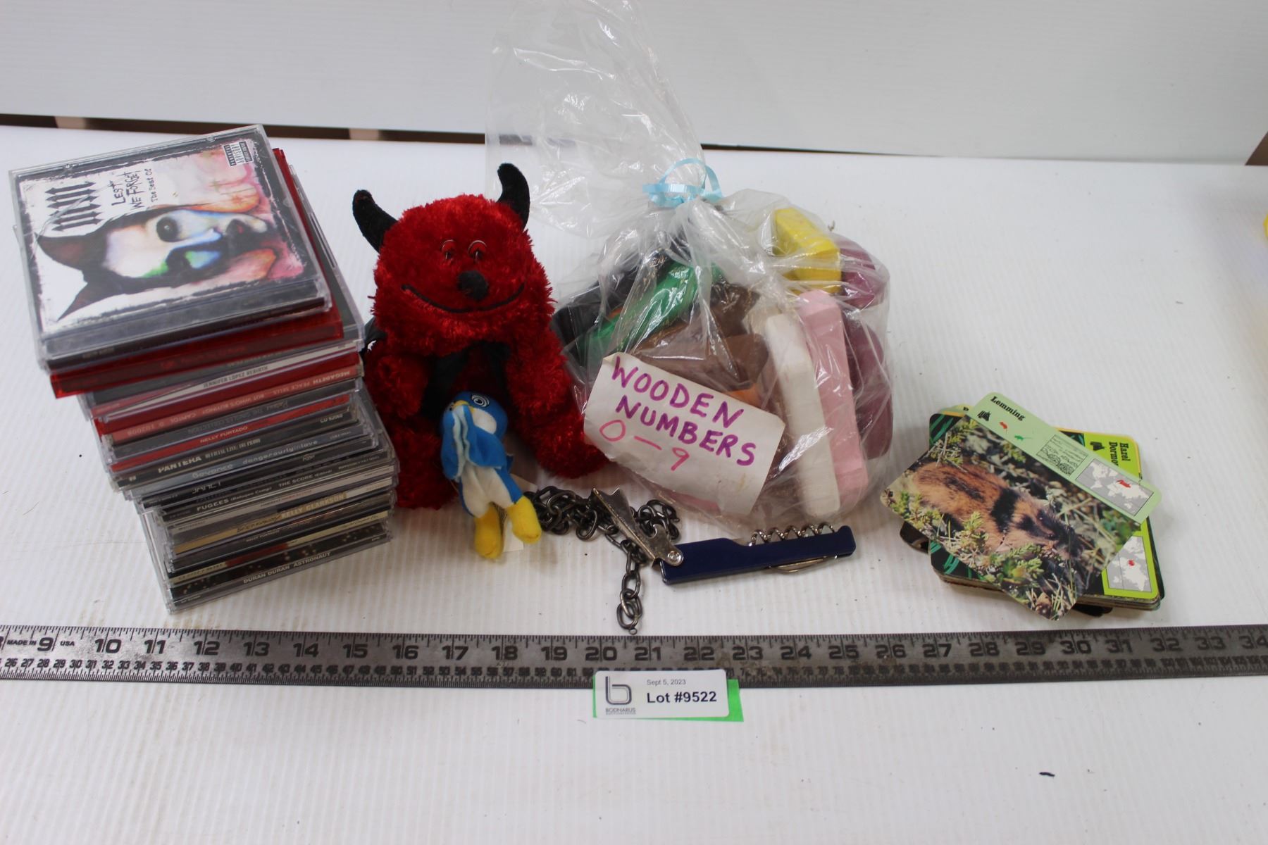 (19)CDs, Stuffed Devil, Wooden Numbers and Other Items