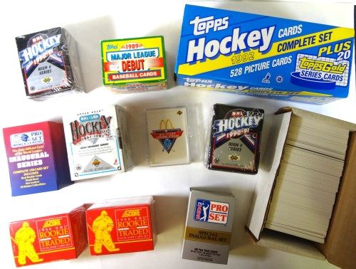 Receive 92/93 Topps Hockey Factory Set, 90/91 Pro-Set Hockey, 90/91 Upper Deck Hockey, 1984/85 Topps (Yzerman Rookie), 2-90/91 Upper Deck Hi #, 2-90/91 Score Rookie Sets, 91 Pro-Set World League, 91/92 Upper Deck Hockey, 90/91 Topps Hockey, 91/92 Pinnacle Hockey, 95/96 Upper Deck Hockey, 91/92 Upper Deck Hockey, 91/92 Stadium Club, 92/93 Ultra, 91/92 Score Bi-Lingual Hockey, 93/94 Leaf Hockey, 91/92 McDonalds Canadian All-Star, All Sets are assumed to be complete but it's possible the hand collated sets could be missing a few cards. This is a large box collection of Hockey Sets in NMMT condition. Est $240-$280