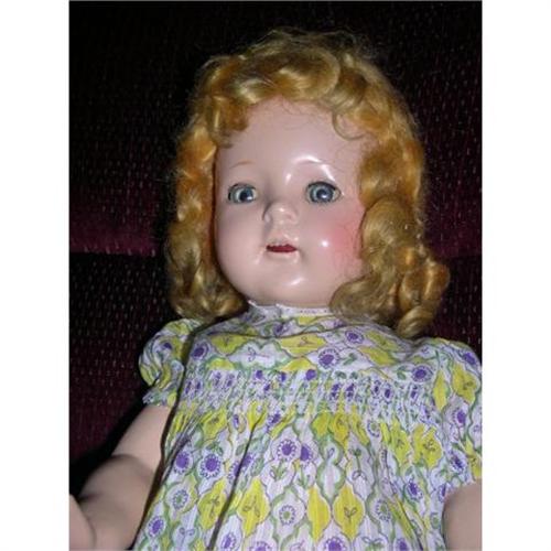 19" Composition Blonde Doll Unmarked. Doll has split along seam of head on one side and she wears just a cute print dress. Wig is thinning, Compo is very nice. Doll has strung on head, arms, and legs. She has all of her lashes but is missing her lip paint. Hopefully someone can love her. Her eyes open and close. Doll comes from a smoke free environment. Buyer to pay 12.00 shipping, handling, and insurance. Thanks for viewing.