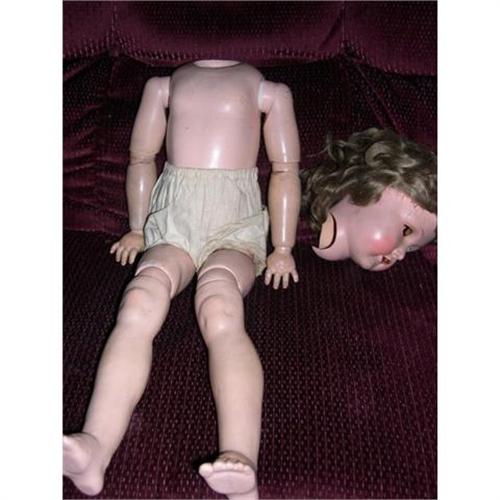 19" Composition Early Flapper Body. With original broken head it is 25" tall. The head was celluloid and is broken and missing pieces. There are no eyes. It is marked K (star sign) R 62/717 Germany. Doll's body is excellent. You are getting the head with the doll but it old easy break more in shipping. The wig is original. Doll comes from a smoke free environment. Buyer to pay 20.00 shipiing, handling, and insurance. Thanks for viewing.