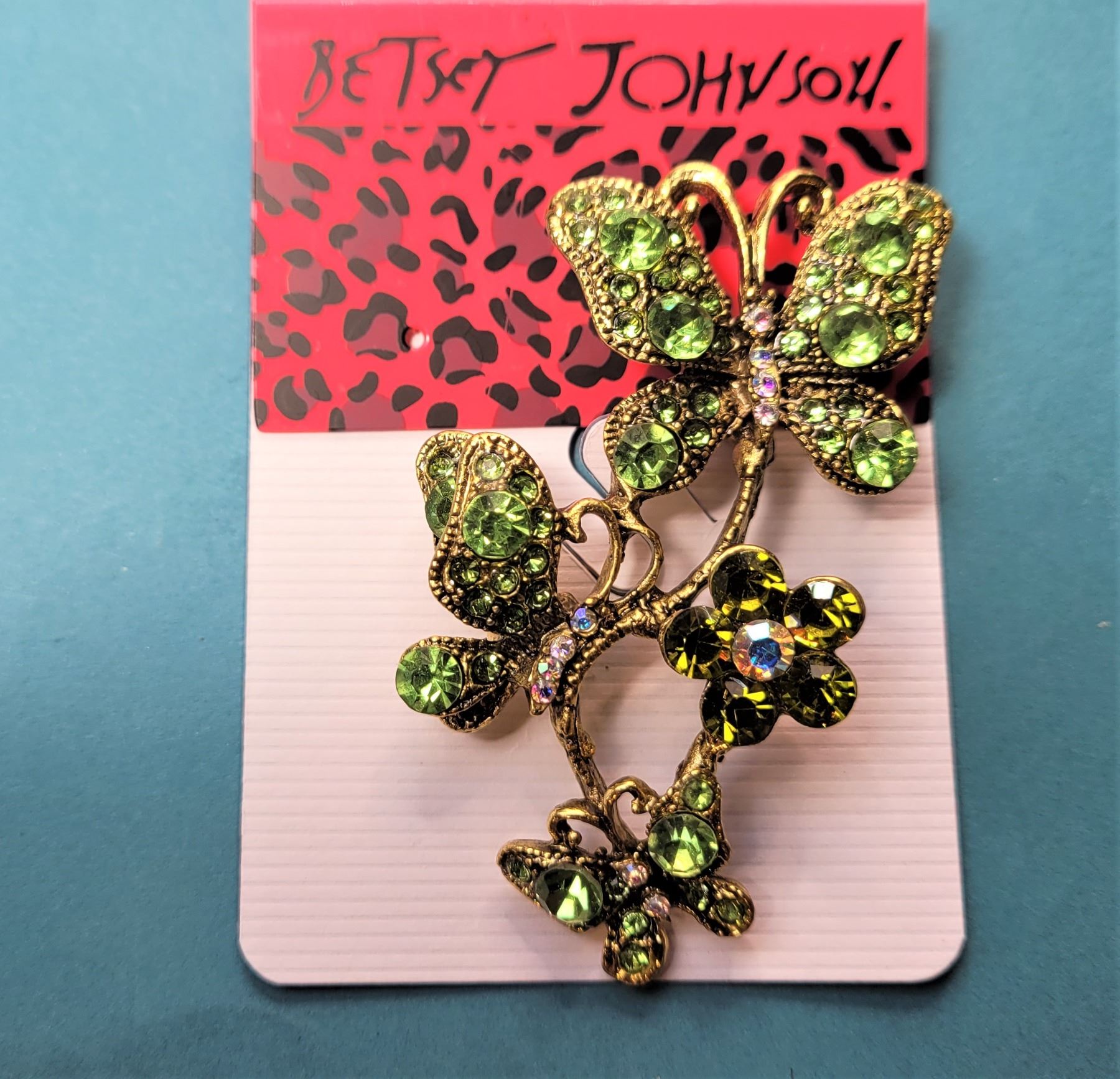 GOLD TONE AND GREEN & MULTI COLORED RHINESTONE BUTTERFLY BROOCH. JEWELLERY