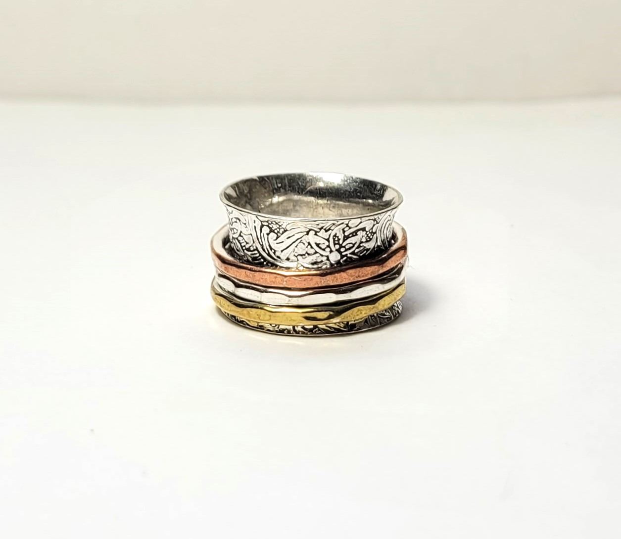 WITH SILVER, GOLD AND COPPER TONE SPINNER RINGS ON TOP, STAMPED 925. JEWELERY