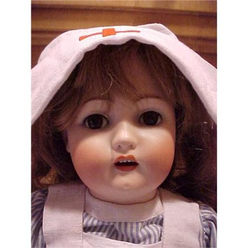 This doll is almost like new. I don't think she was played with very much if at all. I see nothing at all wrong with her bisque. It is lovely and without any damage or repairs. The body is the same way. Has red lines on the fingers and hardly any wear. She is amazing. The wig may be her orignal or an early replacement. The nurse's outfit is great. It fits well and seems to be reasonably clean and without damage. Socks and shoes are appropriate replacements. Her undies are old and possibly original. She is the nicest small cabinet size K*R/ Halbig I have had in a while. Such wonderful condition.