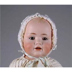 19” KESTNER BABY. Brown glass sleep eyes with wobbly tongue, this baby has painted hair. Affixed on a marked composition baby body. She is wearing an antique Christening gown and bonnet. CONDITION: Mold flaws/firing lines to rear of bisque head. JL 1-2583