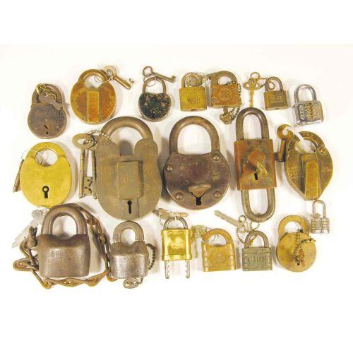 19 Misc. Padlocks including an Honestylockstore by Bombay, Acme, Guard, Safe and two barrels. Various sizes and conditions, all with keys.