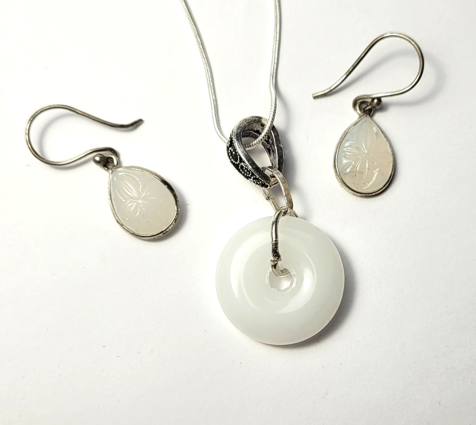 SNAKE CHAIN AND CARVED WHITE JADE PEAR SHAPED DROP EARRING . JEDWELERY