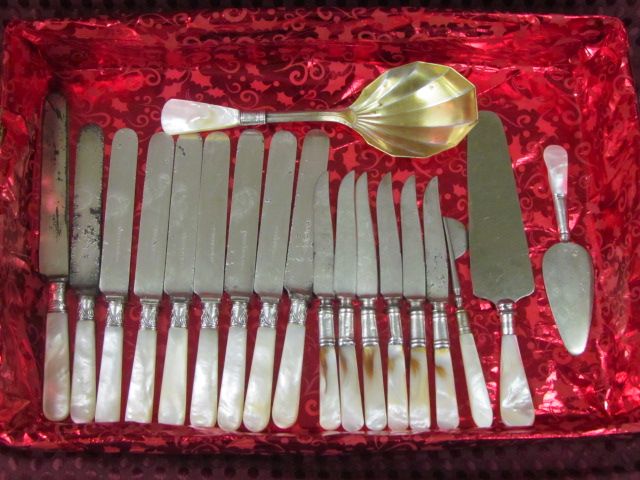 19 pcs. flatware with Mother of Pearl handles and Sterling Silver bands, 9 dinner knives 8", 6 fruit knives 6 3/4 ", 1 pick, 3 serving pcs lg. spoon, cake server and cheese server