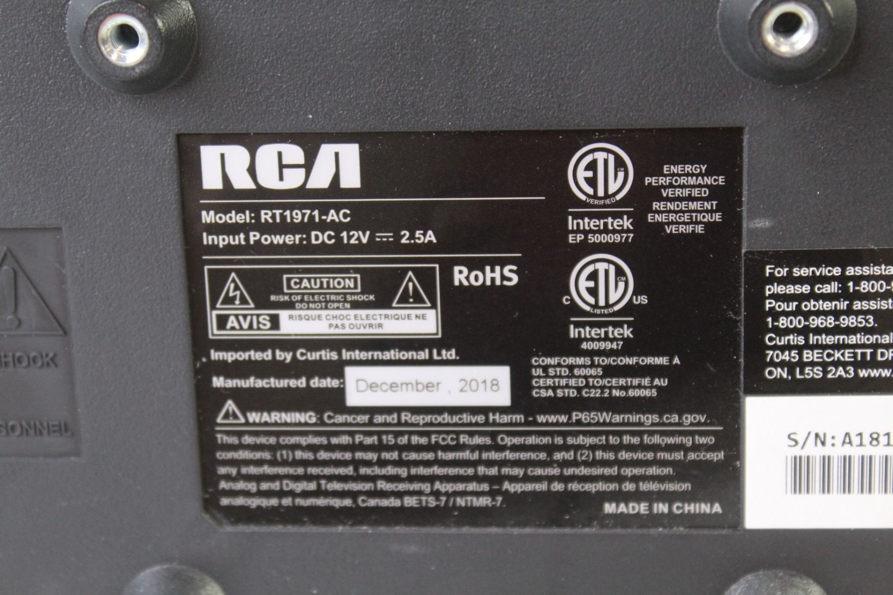 19" RCA Television w/Remote & Power Supply (working)