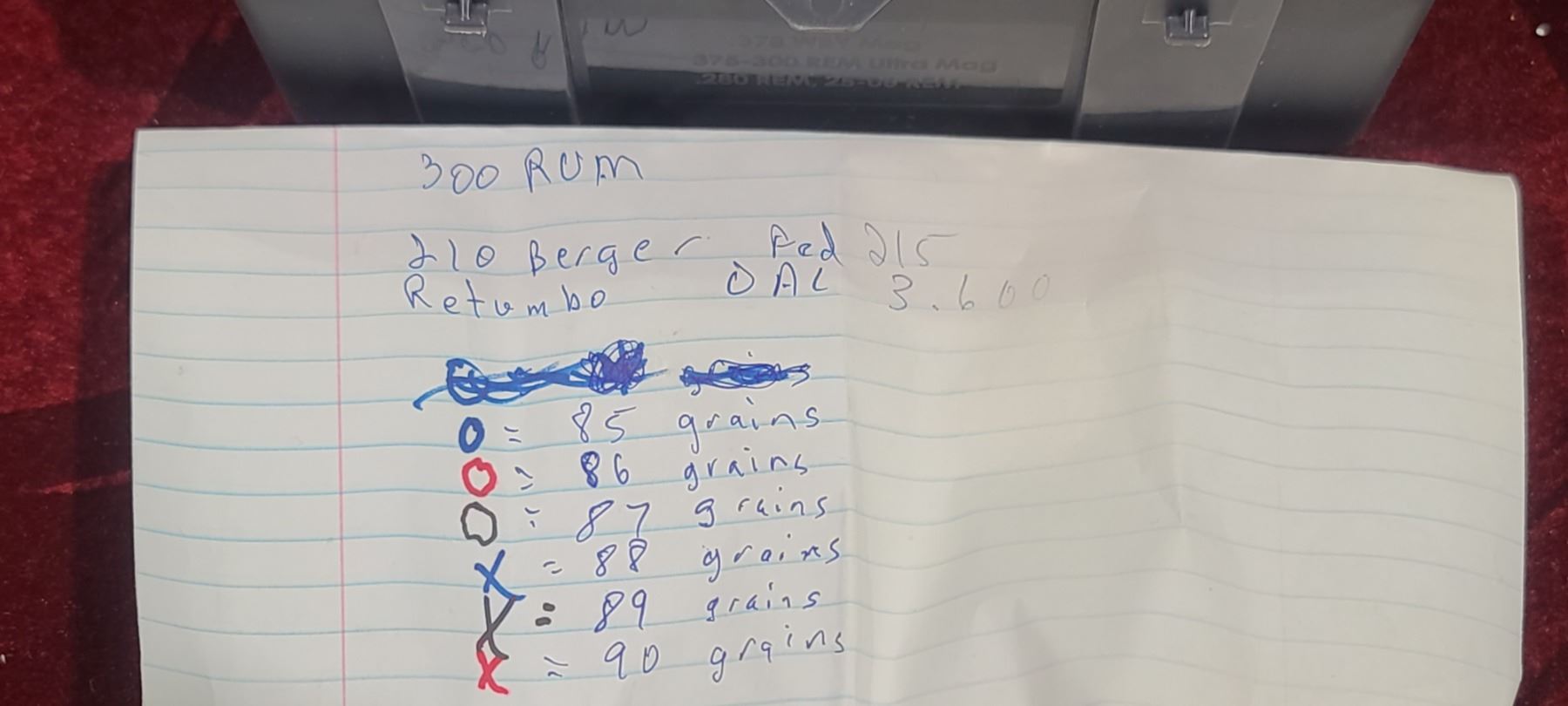 19 ROUNDS OF RUM MAG WITH 210 GR BERGER: QTY4 85GR QTY3 86GR. QTY3 87GR QTY3 WITH 88GR QTY3 WITH 89GR. QTY3 WITH 9GR HANDLOADS
