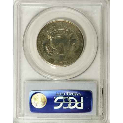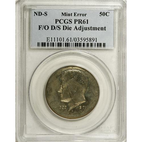 <B>19??-S 50C Kennedy Half--Flipover Double Strike, Die Adjustment--PR61 PCGS.</B></I> The 19 in the date is apparent, as is the S mint mark. Luminous powder-blue and orange patina graces this fascinating mint error. A flipover double strike, with the outline of the right wing visible near the upper part of Kennedy's head, while Kennedy's profile emerges from the base of the eagle. The strikes are very soft, since only about half of the legends are visible. The S mintmark has never appeared on a non-Bicentennial business strike Kennedy half.<BR><BR><b>Shipping:</b> Coins & Currency (<a target="_blank" href="http://www.heritageauctions.com/common/shipping.php">view shipping information</a>)