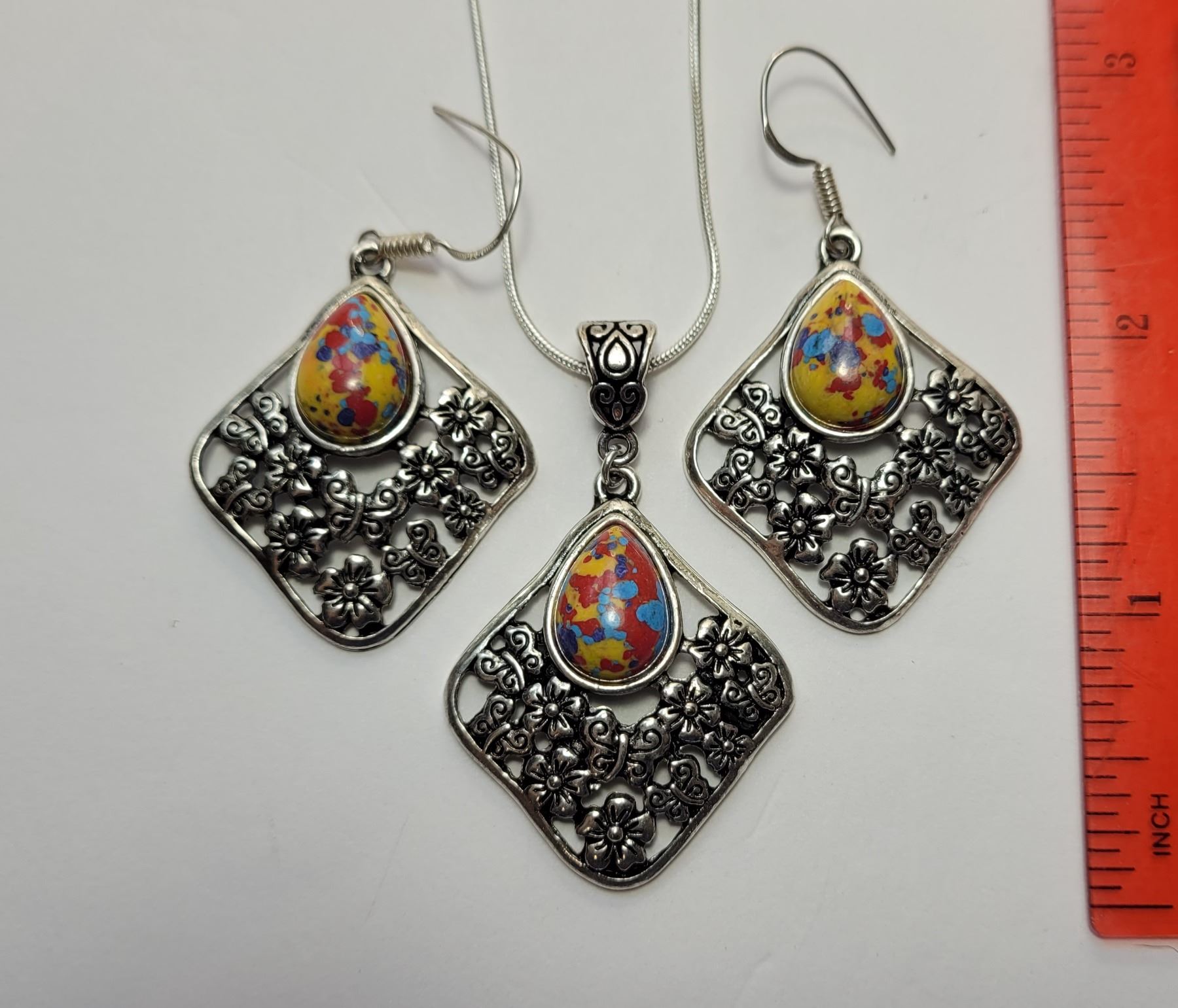 DROP EARRINGS WITH 18" SNAKE CHAIN, SETTINGS ARE OPEN WORK FLOWER & BUTTERFLY MOTIF. JEWELRY
