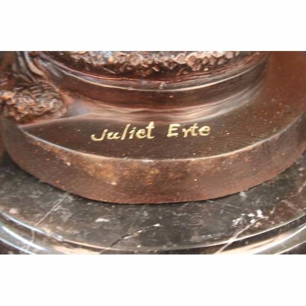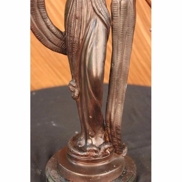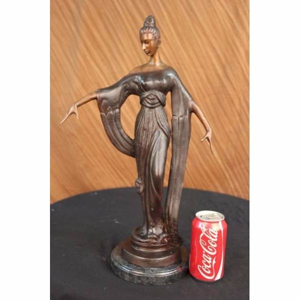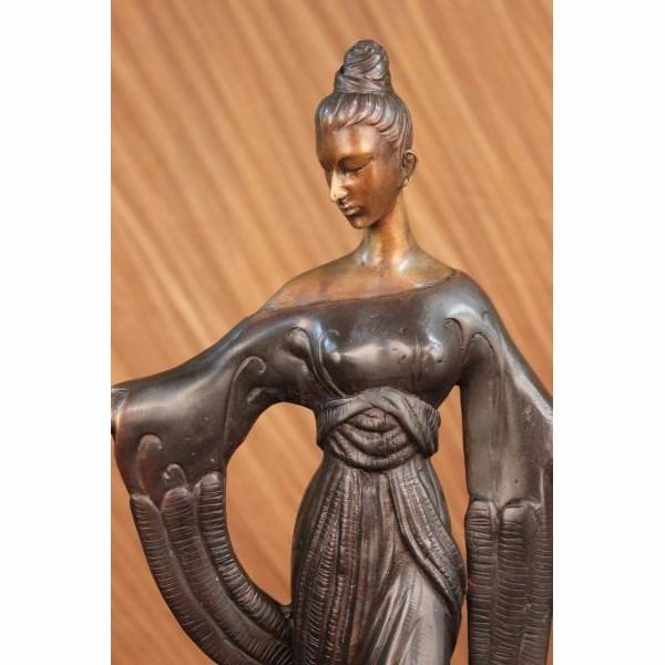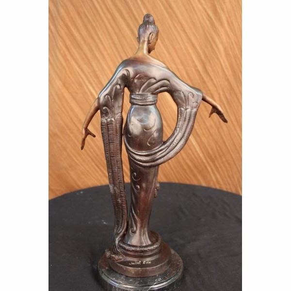 This unique sculpture of a 1920's woman is a beautiful piece for an exquisite living room or a young lady's bedroom. As she stands elegantly for her photo-shoot, who can forget to mention her unforgettable dress that drops all the way to the floor, while she holds an umbrella under her right arm. The details on her neck-less,waist belt, over coat, and her Charleston hat, are unbelievably carved leaving her picture perfected. This is a beautiful bronze sculpture cast using the "Lost Wax Method" and has a gorgeous brown patina. It is mounted on a marble base and is 100% bronze and handmade. Condition: This sculpture is in perfect condition. Bronze Dimensions with Marble Base:Height 19" x Width 11" Marble Dimensions:Diameter 6" . Height without base: 18" Weight : 12 LBS Inventory:50-57948M9005