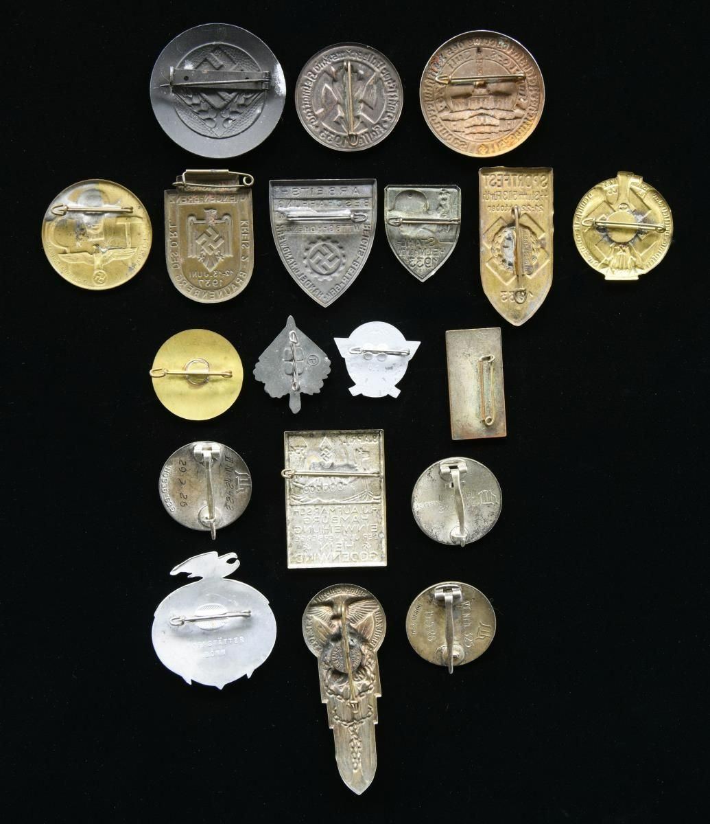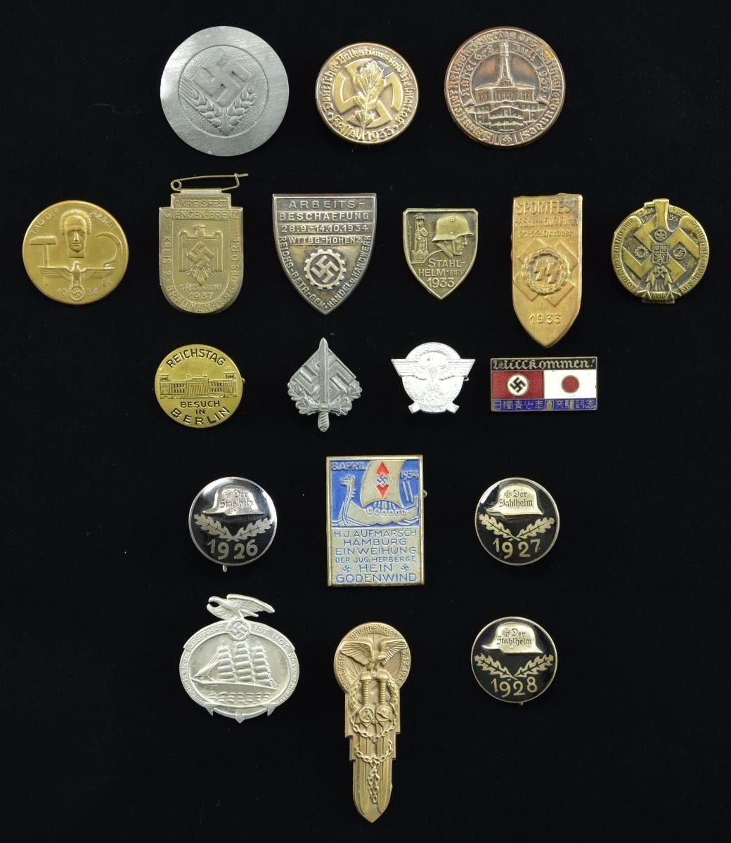 This fine group includes 1 “Der Stahlhelm” black enamel membership badge dated 1926. / 1 “Der Stahlhelm” black enamel membership badge dated 1927. / 1 “Der Stahlhelm” black enamel membership badge dated 1928. / 1 “TAG DER ARBEIT” 1934 tinnie. / 1 “STAHLHELM 18 NOV. 1933” tinnie. / 1 “BAUTZEN BRIGADG.APPEIL 3.12.1933” SA tinnie. / 1 “Die Saar” 1935 tinnie. / 1 RAD women’s brooch. / 1 Black, red, white & blue enamel “Willkommen” pin welcoming Japanese visitors. / 1 Zinc political pin. / 1 “BRAUNENBERG 1937” tinnie. / 1 DAF 1934 tinnie. / 1 Kassel 1933 tinnie. / 1 Seefahrt 1935 tinnie. / 1 “REICHSTAG BESUCH IN BERLIN” gilded brass pin. / 1 Sportfest 1933 tinnie. / 1 Kassel 1935 tinnie. / 1 Police pin of 1942. / 1 “HEIN GODENWIND 1934” HJ tinnie. CONDITION: all badges & tinnies have their original pins and have no notable damage. (02-19036/BF). $800-1,200.