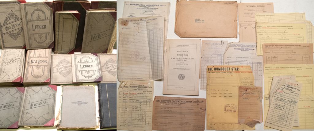 19 journals. One 1912-1922 ledger focuses on philanthropic organizations. Others are day books for items sold to local people and companies: Wonder Company, Life Minor, Fleischman Co., Kasker Pottery, Humboldt Soda Works, Ergiuaga, Star Hotel, etc. Some books are accounts payable to outside companies. Most are 1910 to 1919 and give an historic look into the workings of a mercantile company. Includes billheads from Stephenson Drug Company Haviland Chevrolet , Acton Fisher Tobacco, and Humboldt Star. Other ephemera inside books. Pages and pages of inventory and items sold. Some wear on the books. Many have wear on the covers (warping) and bindings. A few have pages detached from the books.