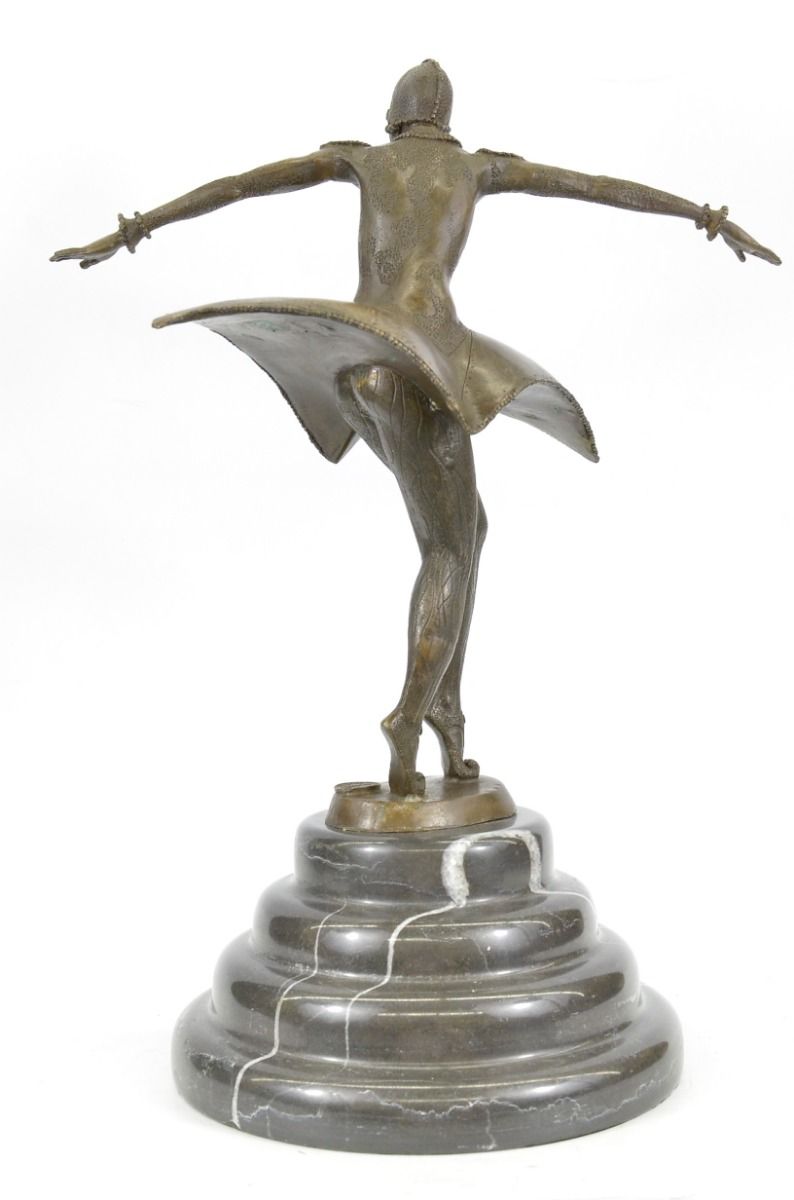 11XN201180 A Wonderfully Symmetrical Sculpture Of A European Dancer Designed By D.H. Chiparus. She Carefully Balances On The Balls Of Her Feet. Exhibiting The Strength And Control Of A Trained Dancer She Extends Her Arms Out Gracefully. Her Unique Skirt Extends Outwards Parallel To Her Skirt. This Delightful Dancer Stands On A Four-Tiered Black Marble Base. The Costuming, Styled Base And Sculpture Design Make This A Wonderfully Decorative Piece. It Was Crafted Using The Lost Wax Method And Is Signed D.H. Chiparus...................SHIPPING USA: $25....HI, ALASKA, CANADA: $69...ALL OTHER COUNTRIES: $169