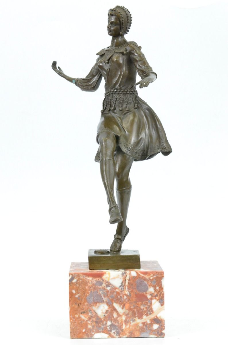 11XN200680 This Astonishing Piece Of Art Is A One Of A Kind. Her Arms Are Out Stretched To Her Side As She Stand On One Leg And Balances, She Is Careful Not To Make A Mistake During Her Performance. She Has Extremely Strong Legs And Arms Adding To Her Uniqueness. She Wears A Special Headdress That Fans Out Behind Her Neck And Her Skirt Heavy With Beads Sways Around Her Legs As She Dances. She Wears A Beaded Bikini Top And A Beaded Necklace Adding To Her Ensemble. Her One Leg Is Out To The Side And Helps Break Up The Sculpture Giving It More Dimension. She Is An Exquisite Piece Of Art And Holds A True Art Deco Feel. This Sculpture Was Cast Using The "Lost Wax Method" And Has A Two Tone Brown Patina With Gold Highlights. She Is Mounted On An Art Deco Styled Black Marble Base And Is 100% Bronze. Joseph Descomps Was A French Artist Born In France In 1869 And Died 1950...................SHIPPING USA: $20....HI, ALASKA, CANADA: $59...ALL OTHER COUNTRIES: $129