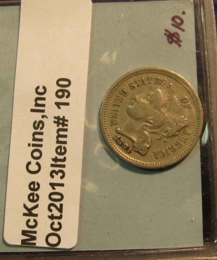 190. 1881 U.S. Three Cent Nickel. VF 20. Redbook value $28.00