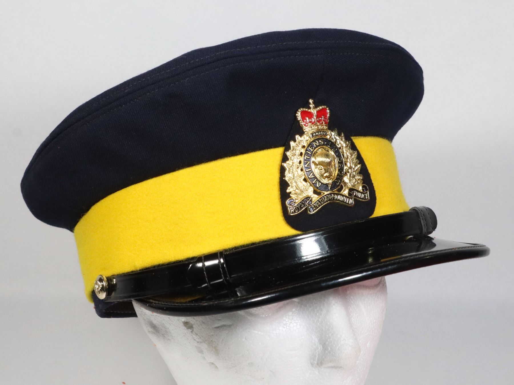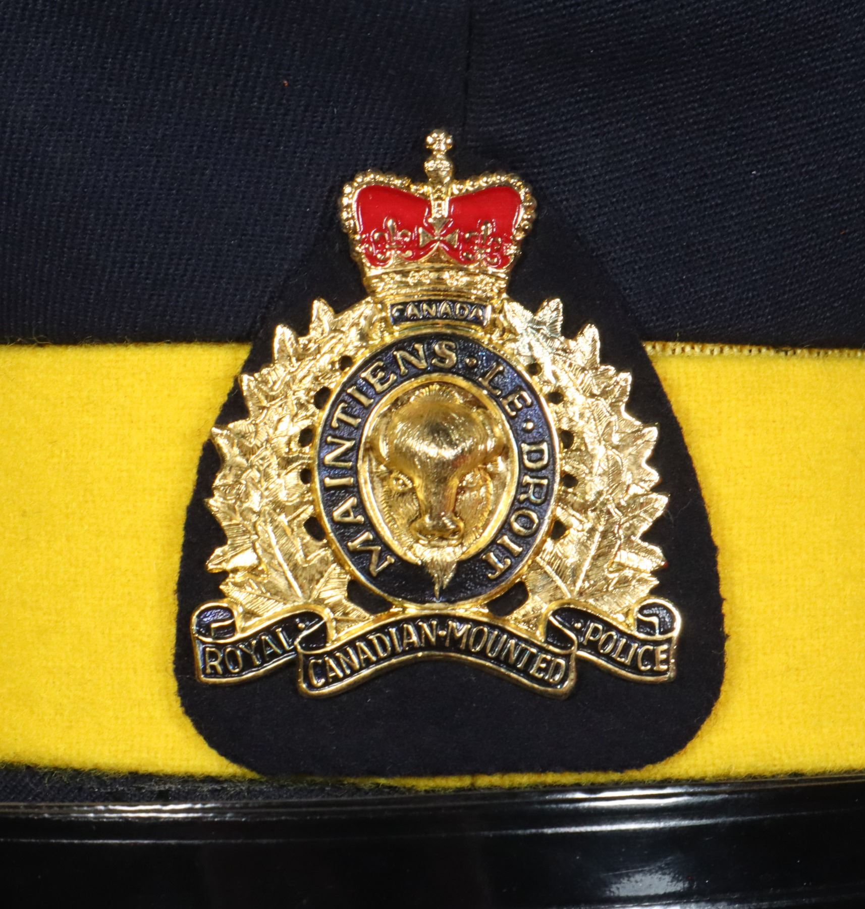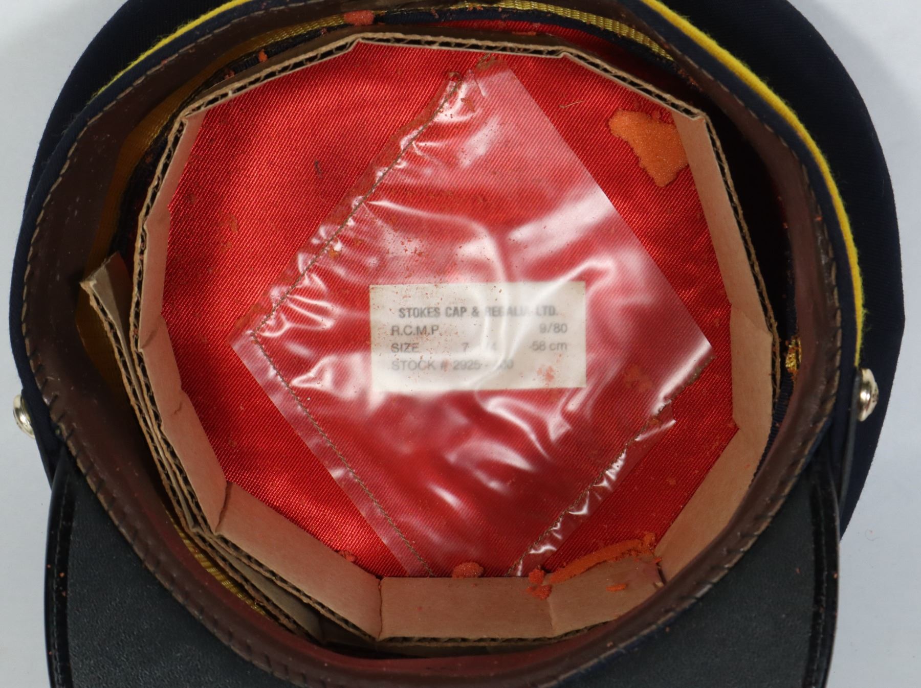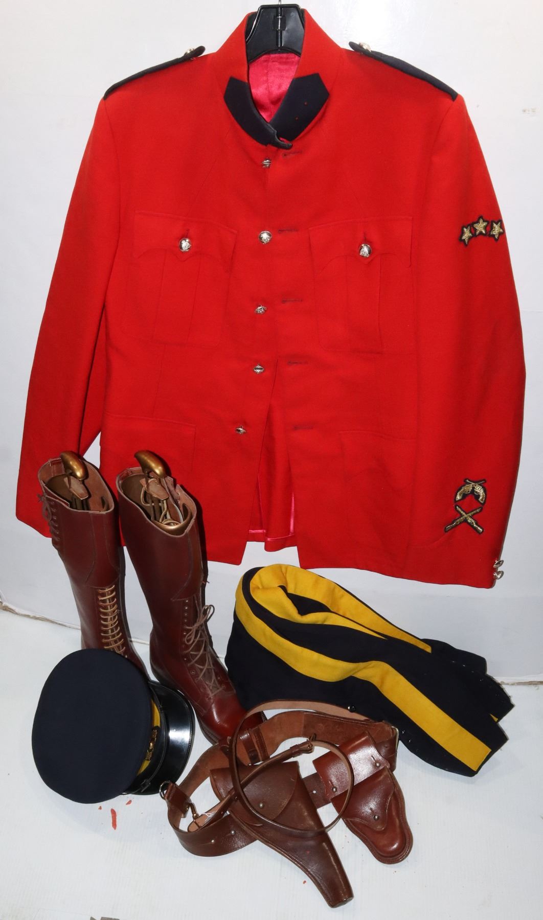 INCLUDES HIGH BROWN BOOTS GOODYEAR 9 1/2 F BELT HOLSTER PANTS 1973 RED SERGE UNIFORM + 1980 DATED PEAKED VISOR CAP + QUEEN ELIZABETH II QEII BADGE