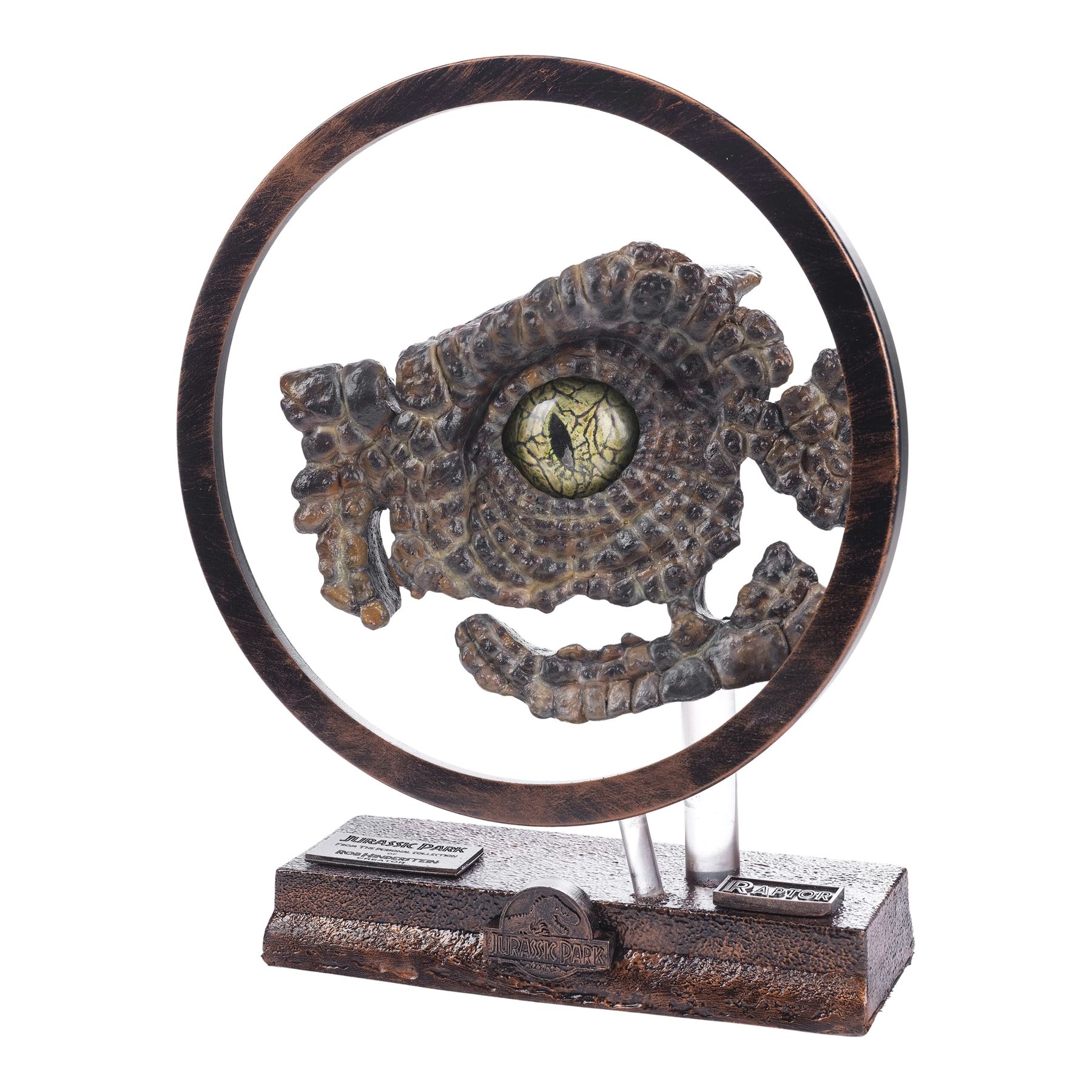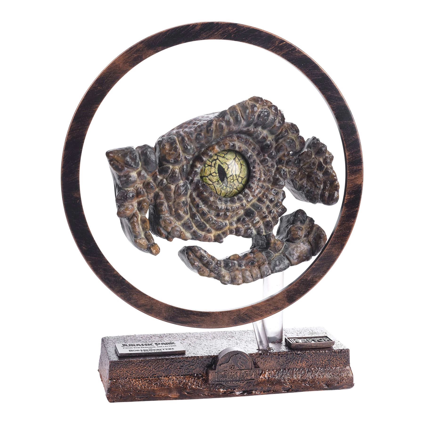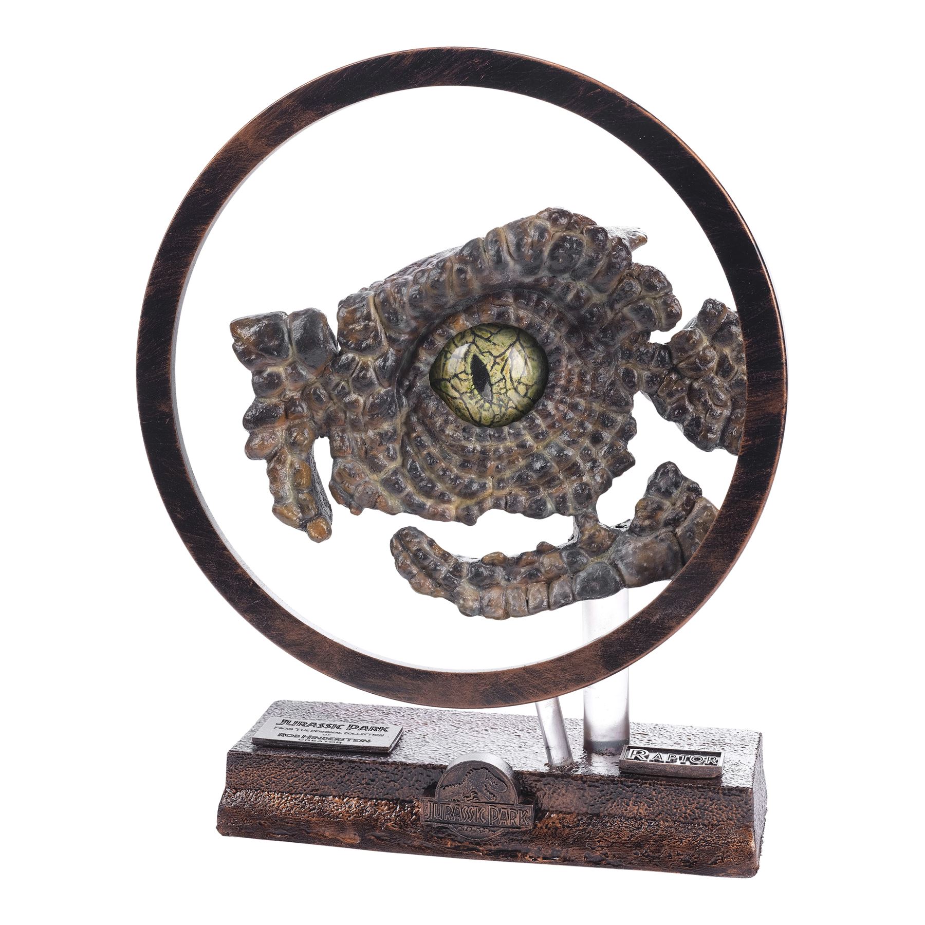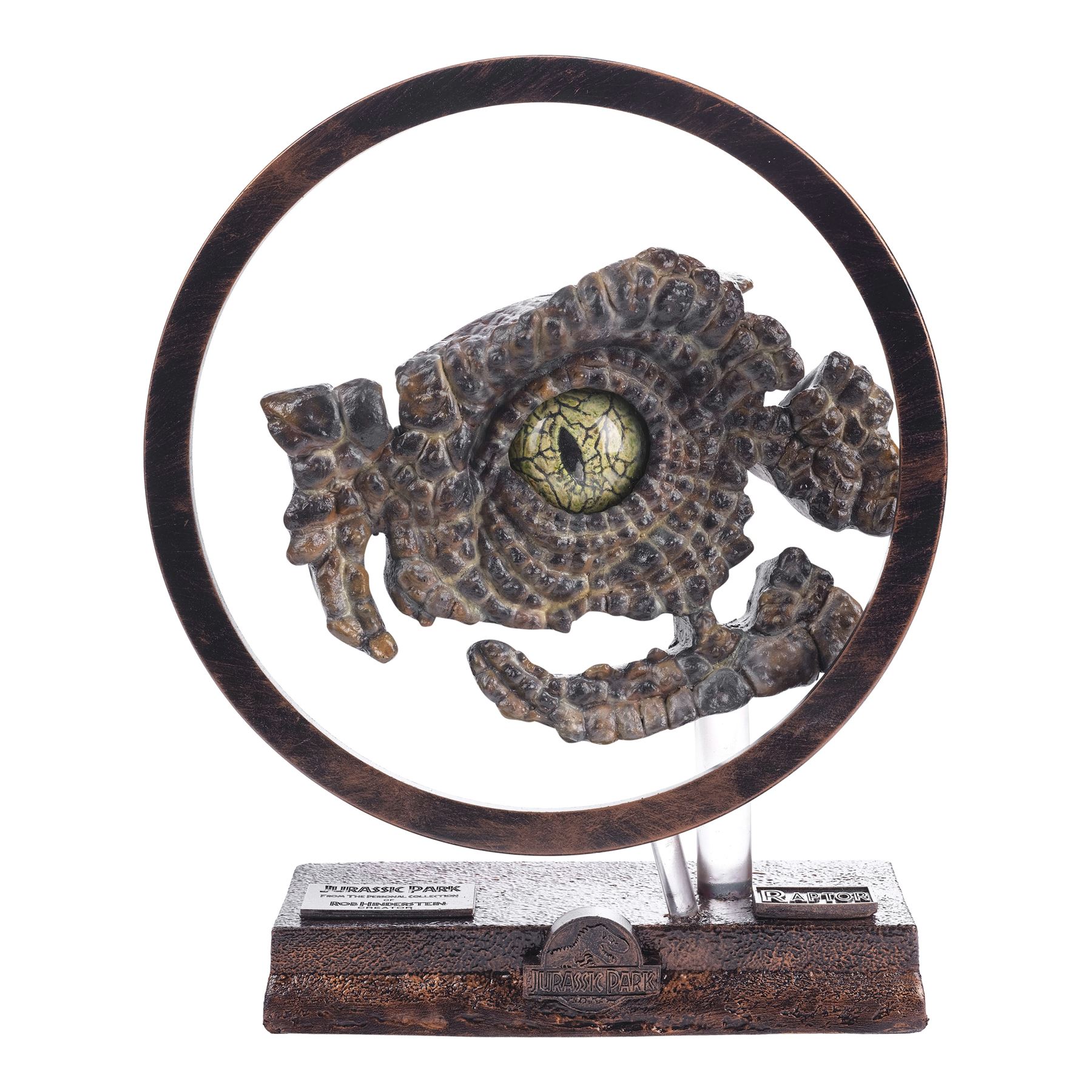 Created post-production, this ornately detailed velociraptor eye with a sculpted yellow and black core, lifelike yellow and brown latticework veins, and a dental acrylic coating was created by key artist Rob Hinderstein at Stan Winston Studios. During production, the eye was inserted into a hand-painted and hand-textured foam and resin velociraptor socket display to demonstrate the dinosaur's potential eye movements to Spielberg. This lot comes on a custom-made, red and black painted resin foam display mounted on a clear acrylic rod. The display is decorated with a red and black painted resin circle mounted on a clear acrylic rod to highlight the eye, and two plaques with one inscribed "Jurassic Park from the personal collection of Rob Hinderstein Creator" and one inscribed "RAPTOR" with a Jurassic Park logo. This lot exhibits chipping material at the back of the display. Dimensions: 14.6" x 4.5" x 16.5" (37 cm x 11.5 cm x 42 cm)