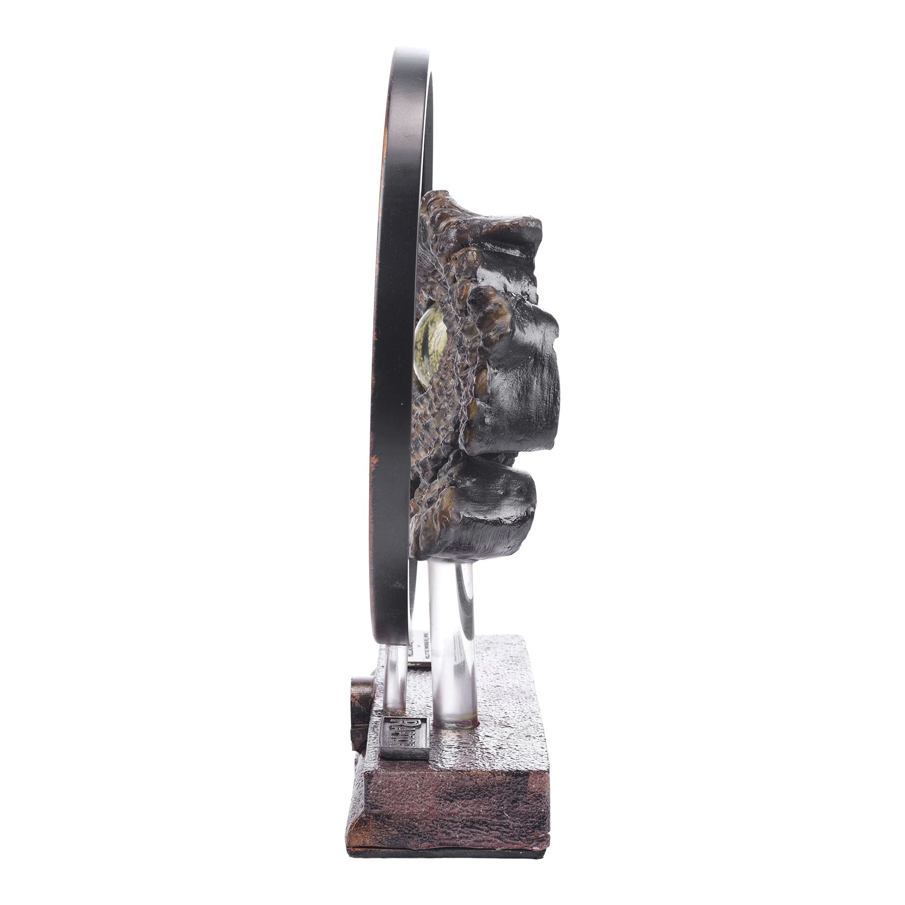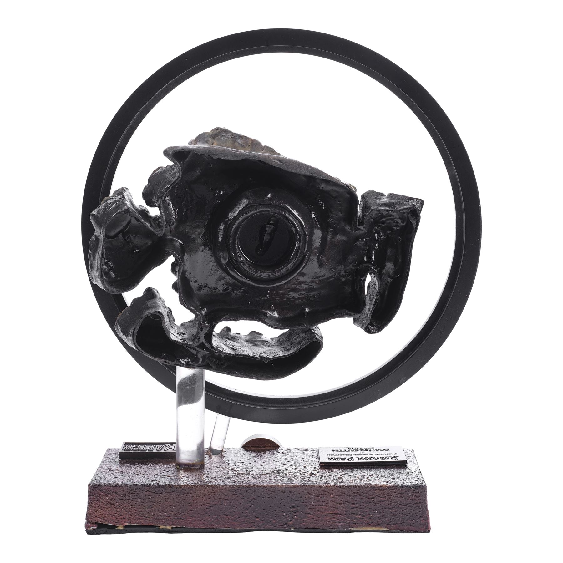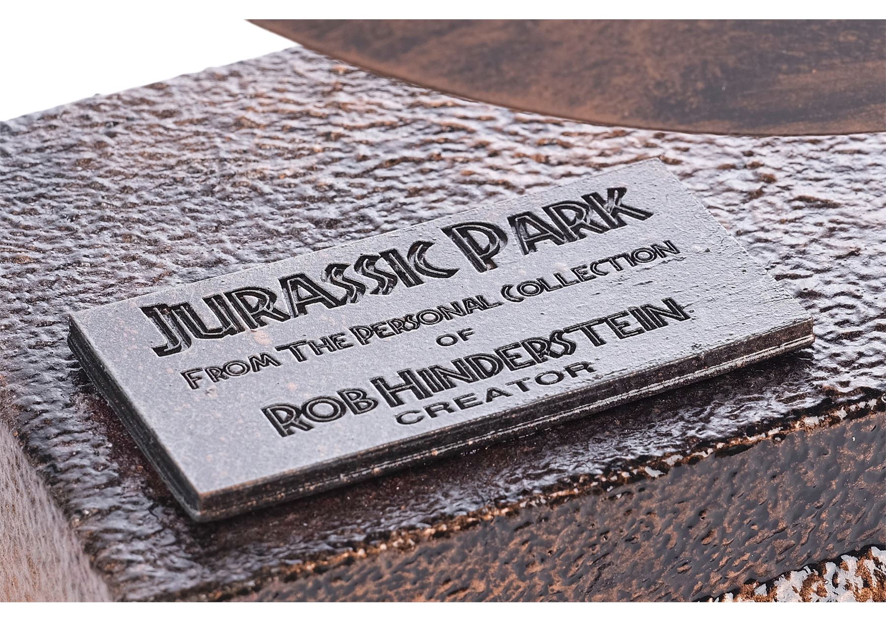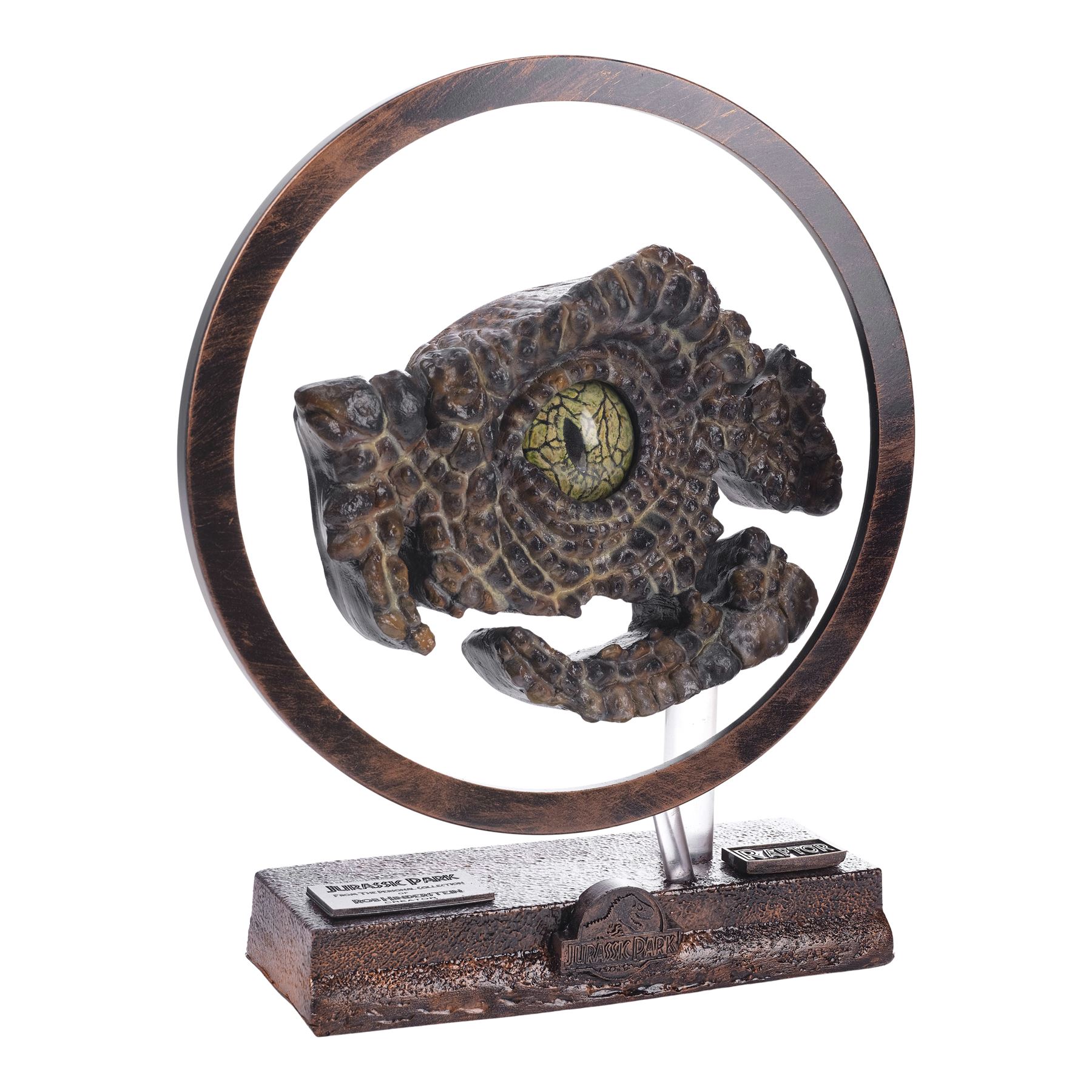 Created post-production, this ornately detailed velociraptor eye with a sculpted yellow and black core, lifelike yellow and brown latticework veins, and a dental acrylic coating was created by key artist Rob Hinderstein at Stan Winston Studios. During production, the eye was inserted into a hand-painted and hand-textured foam and resin velociraptor socket display to demonstrate the dinosaur's potential eye movements to Spielberg. This lot comes on a custom-made, red and black painted resin foam display mounted on a clear acrylic rod. The display is decorated with a red and black painted resin circle mounted on a clear acrylic rod to highlight the eye, and two plaques with one inscribed "Jurassic Park from the personal collection of Rob Hinderstein Creator" and one inscribed "RAPTOR" with a Jurassic Park logo. This lot exhibits chipping material at the back of the display. Dimensions: 14.6" x 4.5" x 16.5" (37 cm x 11.5 cm x 42 cm)