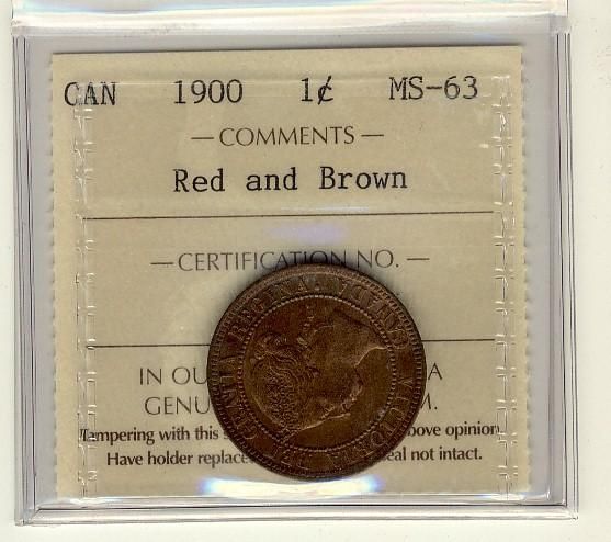 1900 1¢ ICCS MS63 RB, a decent example with good lustre.