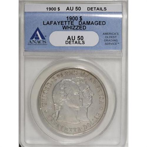 <B>1900 $1 Lafayette Dollar--Damaged, Whizzed--ANACS. AU50 Details.</B></I> NGC Census: (4/2071). PCGS Population (46/2792). Mintage: 36,026. Numismedia Wsl. Price for NGC/PCGS coin in AU50: $465. (#9222)<BR><BR><b>Shipping:</b> Coins & Currency (<a target="_blank" href="http://www.heritageauctions.com/common/shipping.php">view shipping information</a>)