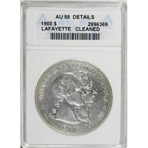 <B>1900 $1 Lafayette Dollar--Cleaned--ANACS. AU58 Details .</B></I> DuVall 3-D, very scarce. NGC Census: (122/1870). PCGS Population (244/2309). Mintage: 36,026. Numismedia Wsl. Price for NGC/PCGS coin in AU58: $525. (#9222)<BR><I>From The Frank DuVall Collection of U.S. Commemoratives.</B></I><BR><BR><b>Shipping:</b> Coins & Currency (<a target="_blank" href="http://www.heritageauctions.com/common/shipping.php">view shipping information</a>)