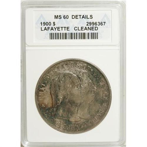 <B>1900 $1 Lafayette Dollar--Cleaned--ANACS. MS60 Details.</B></I> DuVall 2-C. NGC Census: (20/1850). PCGS Population (60/2249). Mintage: 36,026. Numismedia Wsl. Price for NGC/PCGS coin in MS60: $775. (#9222)<BR><I>From The Frank DuVall Collection of U.S. Commemoratives.</B></I><BR><BR><b>Shipping:</b> Coins & Currency (<a target="_blank" href="http://www.heritageauctions.com/common/shipping.php">view shipping information</a>)