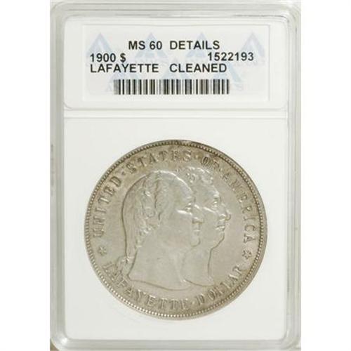 <B>1900 $1 Lafayette Dollar--Cleaned--ANACS. MS60 Details.</B></I> DuVall 2-C. NGC Census: (20/1829). PCGS Population (60/2227). Mintage: 36,026. Numismedia Wsl. Price for NGC/PCGS coin in MS60: $775. (#9222)<BR><BR><b>Shipping:</b> Coins & Currency (<a target="_blank" href="http://www.heritageauctions.com/common/shipping.php">view shipping information</a>)