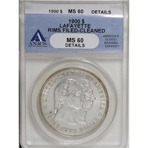 <B>1900 $1 Lafayette Dollar--Cleaned, Rim Filed--ANACS .MS60 Details.</B></I> NGC Census: (21/1892). PCGS Population (60/2333). Mintage: 36,026. Numismedia Wsl. Price for NGC/PCGS coin in MS60: $800. (#9222)<BR><BR><b>Shipping:</b> Coins & Currency (<a target="_blank" href="http://www.heritageauctions.com/common/shipping.php">view shipping information</a>)