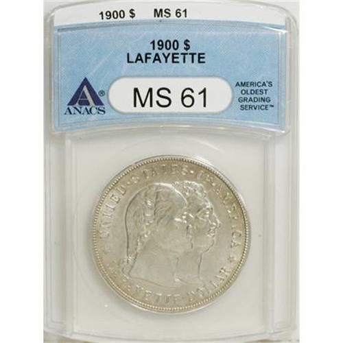 <B>1900 $1 Lafayette Dollar MS61 ANACS.</B></I> DuVall 1-A, very scarce. NGC Census: (146/1704). PCGS Population (104/2145). Mintage: 36,026. Numismedia Wsl. Price for NGC/PCGS coin in MS61: $850. (#9222)<BR><I>From The Frank DuVall Collection of U.S. Commemoratives.</B></I><BR><BR><b>Shipping:</b> Coins & Currency (<a target="_blank" href="http://www.heritageauctions.com/common/shipping.php">view shipping information</a>)