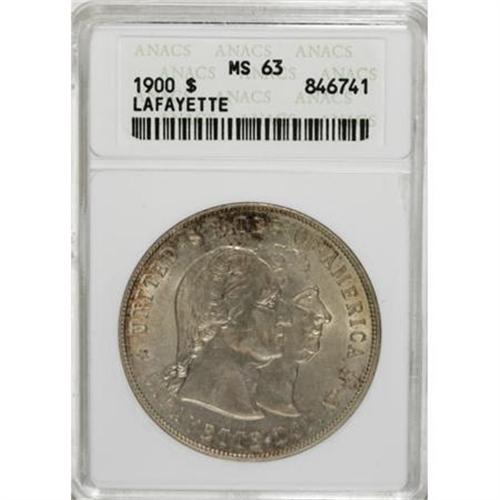 <B>1900 $1 Lafayette Dollar MS63 ANACS.</B></I> Variety 2-C. This issue honors General Lafayette, who voluntarily traveled from France at age 19 to join the American Revolution, and served ably on the staff of George Washington. This Select example is well struck and lightly toned, showing gold-gray color with attractive russet and forest-green peripheral accents. Surface marks are minimal for the grade.<BR><BR><b>Shipping:</b> Coins & Currency (<a target="_blank" href="http://www.heritageauctions.com/common/shipping.php">view shipping information</a>)