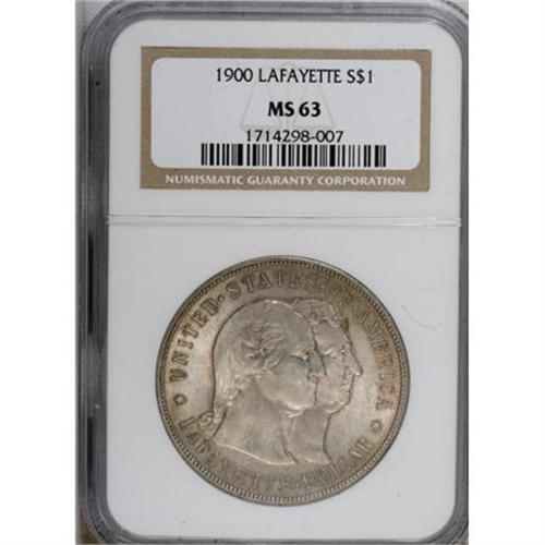 <B>1900 $1 Lafayette Dollar MS63 NGC.</B></I> NGC Census: (458/904). PCGS Population (638/1130). Mintage: 36,026. Numismedia Wsl. Price for NGC/PCGS coin in MS63: $1,800. (#9222)<BR><BR><b>Shipping:</b> Coins & Currency (<a target="_blank" href="http://www.heritageauctions.com/common/shipping.php">view shipping information</a>)