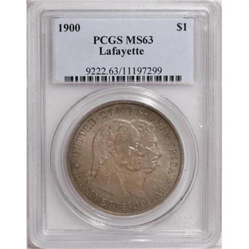 <B>1900 $1 Lafayette Dollar MS63 PCGS.</B></I> DuVall 2-C. Dove-gray and golden-tan endow the obverse, while the reverse is primarily blue-green. Patient rotation beneath a light and loupe locates faint slide marks on the highpoints of Washington.<BR><BR><b>Shipping:</b> Coins & Currency (<a target="_blank" href="http://www.heritageauctions.com/common/shipping.php">view shipping information</a>)