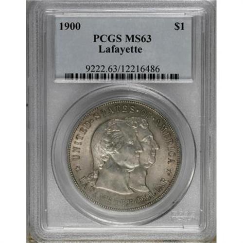 <B>1900 $1 Lafayette Dollar MS63 PCGS.</B></I> DuVall 1-B. On this variety, the leaf on the reverse points between the 1 and 9 in the date, and on the obverse the A in DOLLAR is low and leans left. Gray and lilac patina visits the peripheries of this Select commemorative. A few minor contacts are visible on each side.<BR><BR><b>Shipping:</b> Coins & Currency (<a target="_blank" href="http://www.heritageauctions.com/common/shipping.php">view shipping information</a>)