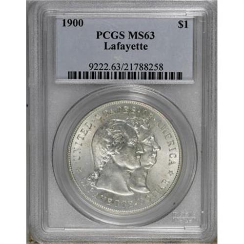 <B>1900 $1 Lafayette Dollar MS63 PCGS.</B></I> DuVall 2-C. The lightly abraded obverse is minimally toned with soft, pleasing luster, while the reverse shows speckles of olive and tan-gold patina. Well struck overall, though the equestrian statue on the reverse shows typical softness.<BR><BR><b>Shipping:</b> Coins & Currency (<a target="_blank" href="http://www.heritageauctions.com/common/shipping.php">view shipping information</a>)