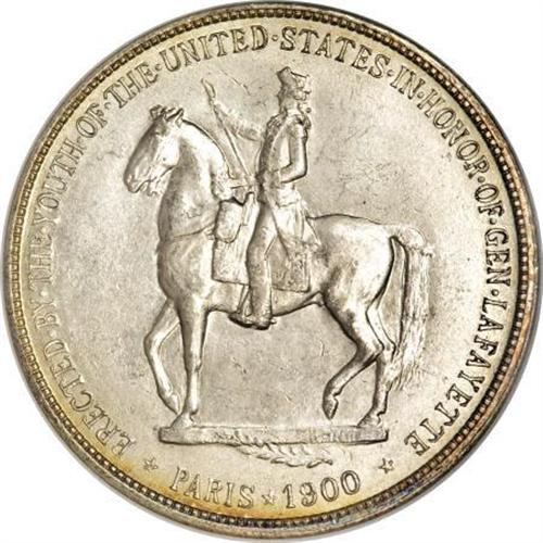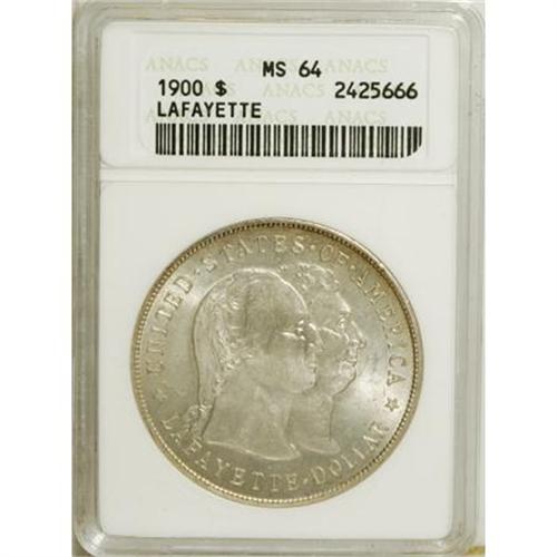 <B>1900 $1 Lafayette Dollar MS64 ANACS.</B></I> DuVall 2-C with a repunched second S in STATES. Lustrous for the type with attractive light gold toning that deepens slightly throughout the margins. The distributed small marks are consistent with the grade. The only commemorative silver dollar prior to 1983.<BR><BR><b>Shipping:</b> Coins & Currency (<a target="_blank" href="http://www.heritageauctions.com/common/shipping.php">view shipping information</a>)
