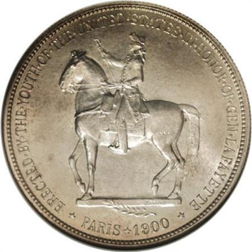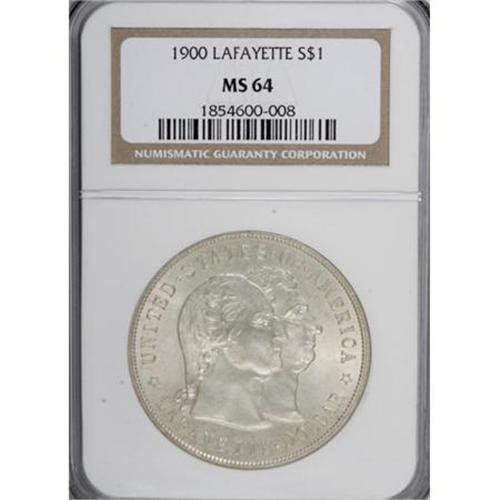 <B>1900 $1 Lafayette Dollar MS64 NGC.</B></I> DuVall 2-C. Varieties 1-B and 2-C are the common varieties of the Lafayette dollar as described by Frank DuVall. This piece is a lovely Choice Mint State example with sharp details and satiny brilliance, accented by pale gold toning on both sides.<BR><BR><b>Shipping:</b> Coins & Currency (<a target="_blank" href="http://www.heritageauctions.com/common/shipping.php">view shipping information</a>)