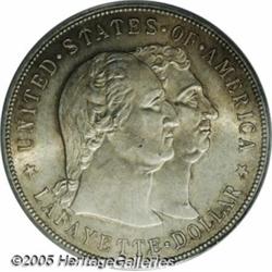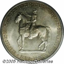 <B>1900<img border='0' src='http://www.heritagecoins.com/images/star.gif' width=10 height=10>$1 Lafayette Dollar MS64 PCGS.</B></I> DuVall 1-B. This is one of few post-dated commemorative issues, having been struck in December 1899, despite the 1900 date that is born on the physical coin. It is a sharply struck example, even including some detail in Lafayette's boot, an area that is often completely obliterated. The surfaces have full frosty luster with pale gold toning over grayish-brown color.