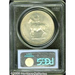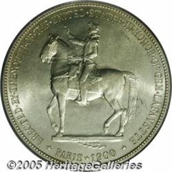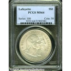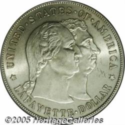 <B>1900<img border='0' src='http://www.heritagecoins.com/images/star.gif' width=10 height=10>$1 Lafayette Dollar MS64 PCGS.</B></I> DuVall 2-C. A Choice example of this large silver commemorative. Lustrous and mostly untoned, with nice surfaces for the grade. Both Washington and the Marquis de Lafayette are two of America's greatest heroes. Lafayette joined the American Revolutionary cause at his own expense and assisted greatly in the defeat of the English. His death occasioned almost as much mourning and grief in America as did that of Washington.