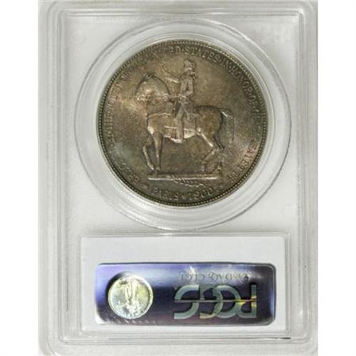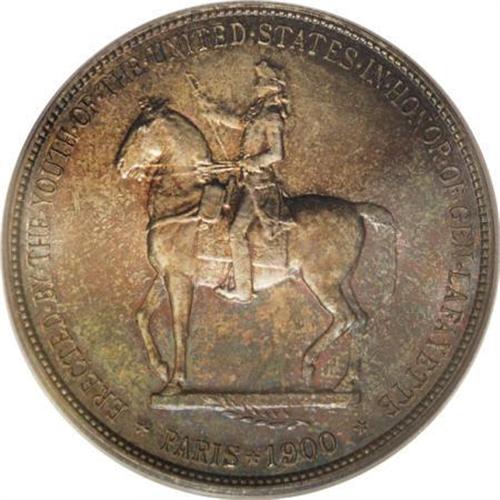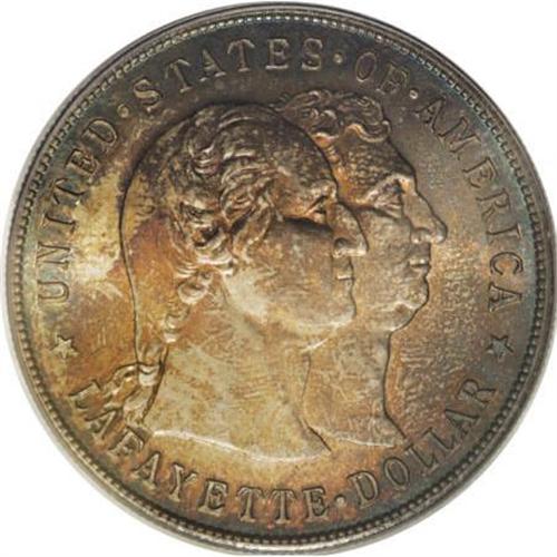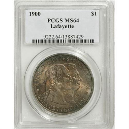 <B>1900 $1 Lafayette Dollar MS64 PCGS.</B></I> DuVall 2-C. The repunched second S in STATES is diagnostic. Rich golden-brown and forest-green compete for territory across this lustrous and attentively struck Lafayette dollar. The fields are beautifully preserved, and the portraits have only a few thin marks.<BR><I>From The Frank DuVall Collection of U.S. Commemoratives.</B></I><BR><BR><b>Shipping:</b> Coins & Currency (<a target="_blank" href="http://www.heritageauctions.com/common/shipping.php">view shipping information</a>)
