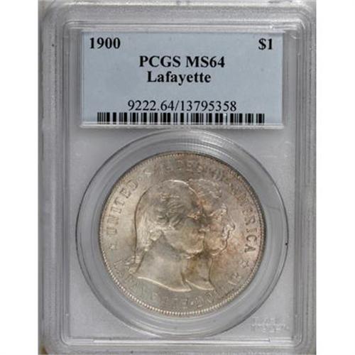 <B>1900 $1 Lafayette Dollar MS64 PCGS.</B></I> DuVall 1-B. Just the slightest hint of toning is seen on the obverse and there is none on the reverse. This brightness allows the satiny mint luster to shine on each side. A remarkably clean coin with just a few minor abrasions present, the only one that is visible without a magnifier is on the highpoint of Washington's cheek.<BR><BR><b>Shipping:</b> Coins & Currency (<a target="_blank" href="http://www.heritageauctions.com/common/shipping.php">view shipping information</a>)