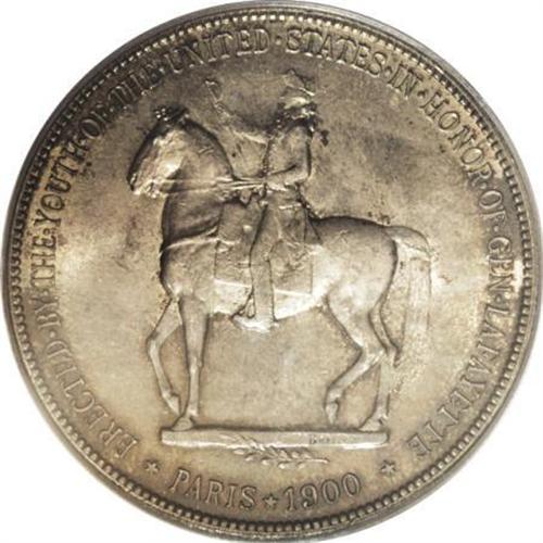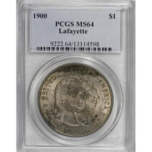 <B>1900 $1 Lafayette Dollar MS64 PCGS.</B></I> DuVall 1-B. A pleasing Mint State example, this Choice representative has delicate olive and steel toning on both sides. Most of the obverse design is sharply defined, and the reverse has slight weakness on the seated figure. The Lafayette design is the only silver dollar commemorative produced prior to the modern era.<BR><BR><b>Shipping:</b> Coins & Currency (<a target="_blank" href="http://www.heritageauctions.com/common/shipping.php">view shipping information</a>)