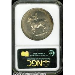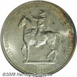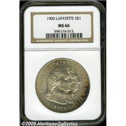 <B>1900<img border='0' src='http://www.heritagecoins.com/images/star.gif' width=10 height=10>$1 Lafayette Dollar MS66 NGC.</B></I> DuVall 3-D. This is an awe inspiring example of this popular, crown-sized early commemorative. Commemoratives have long been one of the most popular series for collectors and the appearance of a premium quality Lafayette has always stirred excitement. Both sides are subtly toned with a small area of cobalt-blue and russet color at the right border areas on each side. The otherwise bright surfaces exhibit a vibrant, satiny appearance, being remarkably free of coin-to-coin contact. The typical Lafayette Dollar, an issue that was sold in great numbers to the non-collecting general public, is lightly circulated and often cleaned. Even a pleasing MS63 specimen can be difficult to find. High-end coins, above the grade of MS65, are of the utmost rarity and quickly absorbed by the serious commemorative collector. To this we add that the Lafayette Dollar is one of the keys to the U.S. Commemorative set in the finer Mint State grades; few coins display surfaces as smooth and blatantly original as those of the present MS66 specimen. Destined for the finest set. Population: 56 in 66, 7 finer (2/05).