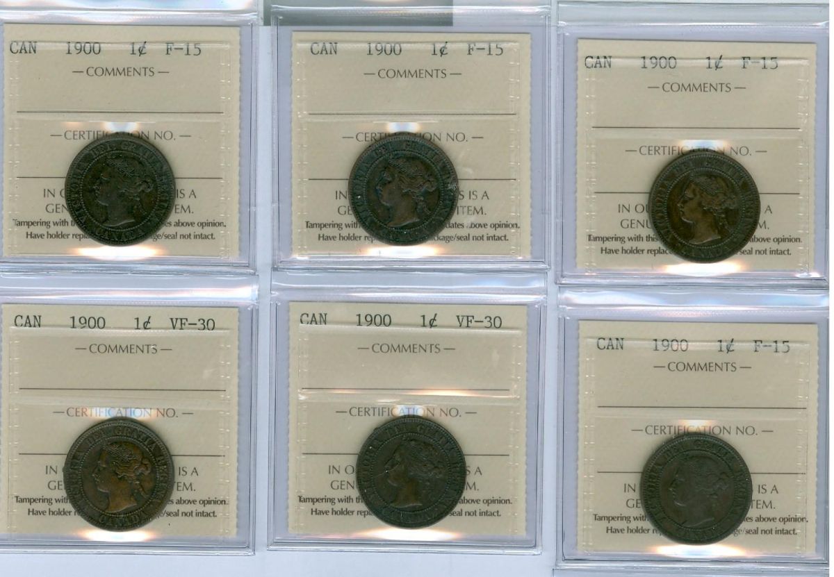 1900 1¢ Lot of 6 ICCS graded coins, F15 (4), VF30 (2).
