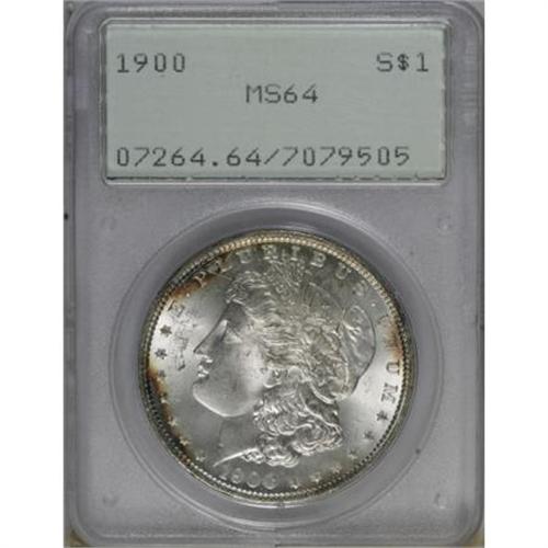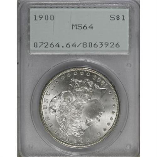 <B>(2)1900 $1 MS64 PCGS.</B></I><BR><BR><B>Coin Engraver:</B> George T. Morgan<BR><BR><b>Shipping:</b> Coins & Currency (<a target="_blank" href="http://www.heritageauctions.com/common/shipping.php">view shipping information</a>)