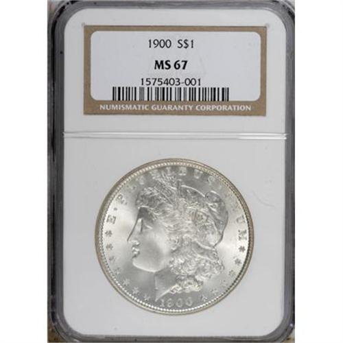 <B>1900 $1 MS67 NGC.</B></I> Glowing luster adorns both sides of this gorgeous untoned Superb Gem, and minimally abraded surfaces are in concert with the grade designation. A well directed strike left sharp definition on the design elements, including the eagle's breast feathers, an area that is often weak on this issue. Census: 28 in 67, 0 finer (6/07).<BR><BR><B>Coin Engraver:</B> George T. Morgan<BR><BR><b>Shipping:</b> Coins & Currency (<a target="_blank" href="http://www.heritageauctions.com/common/shipping.php">view shipping information</a>\)